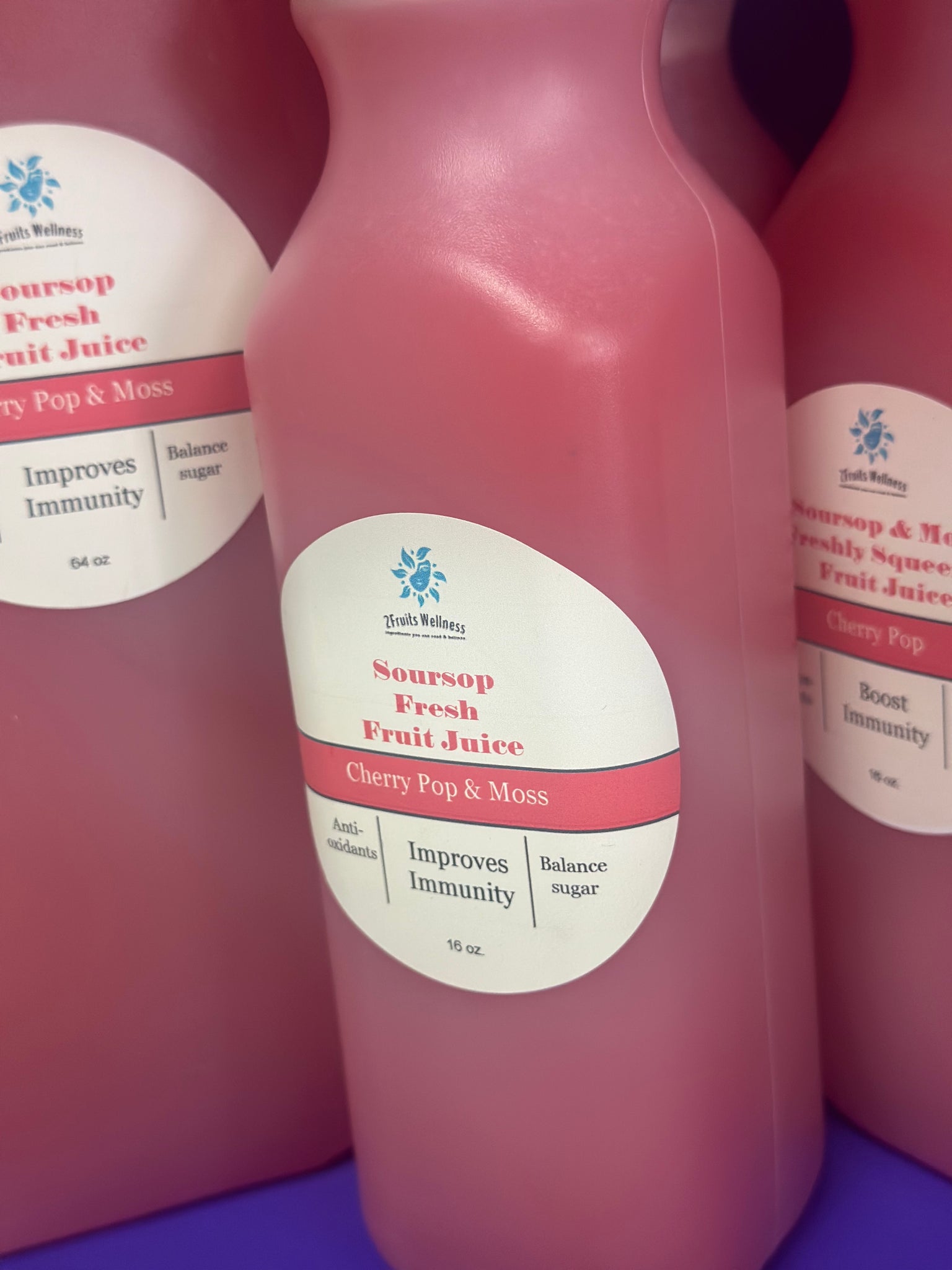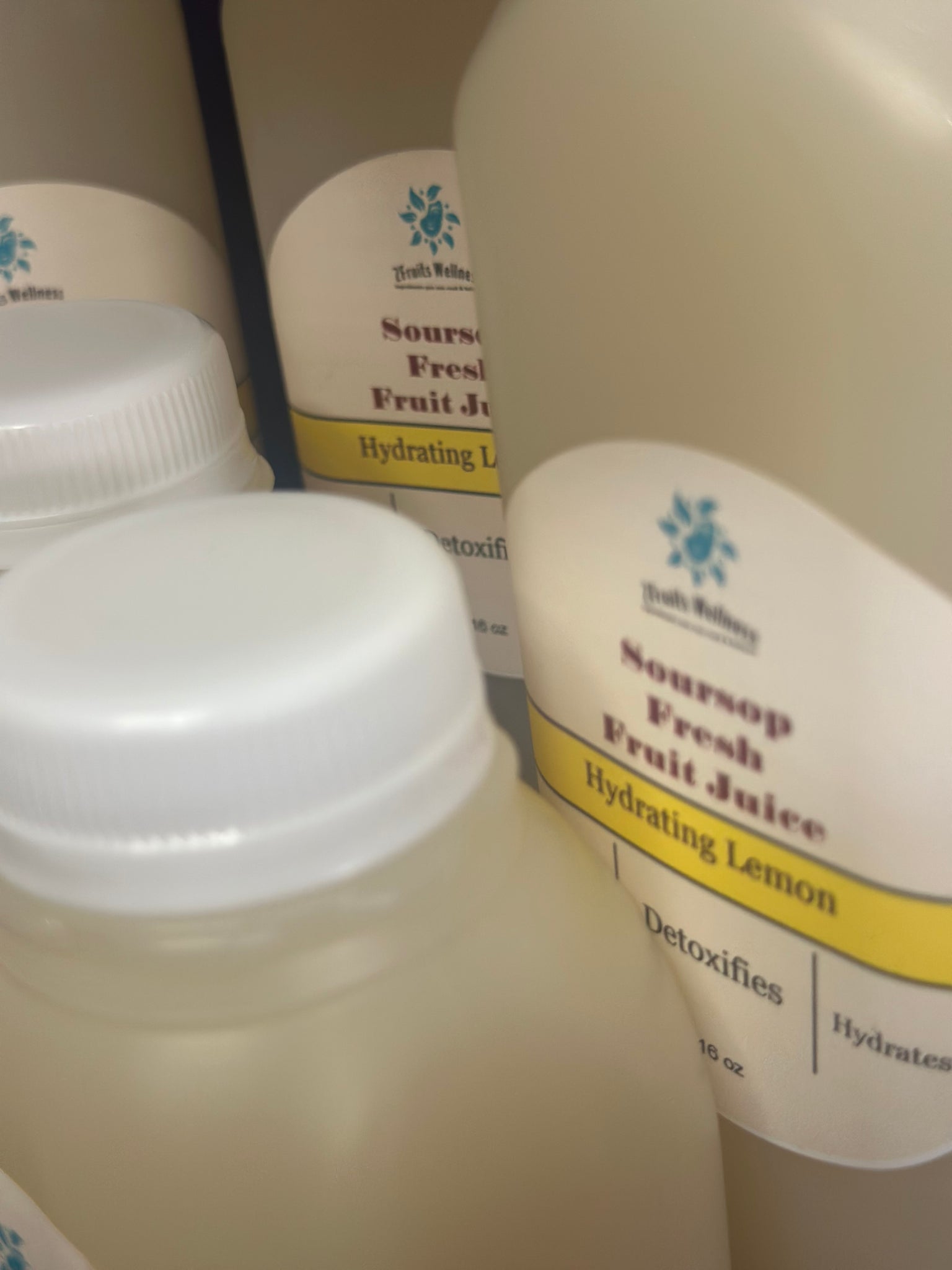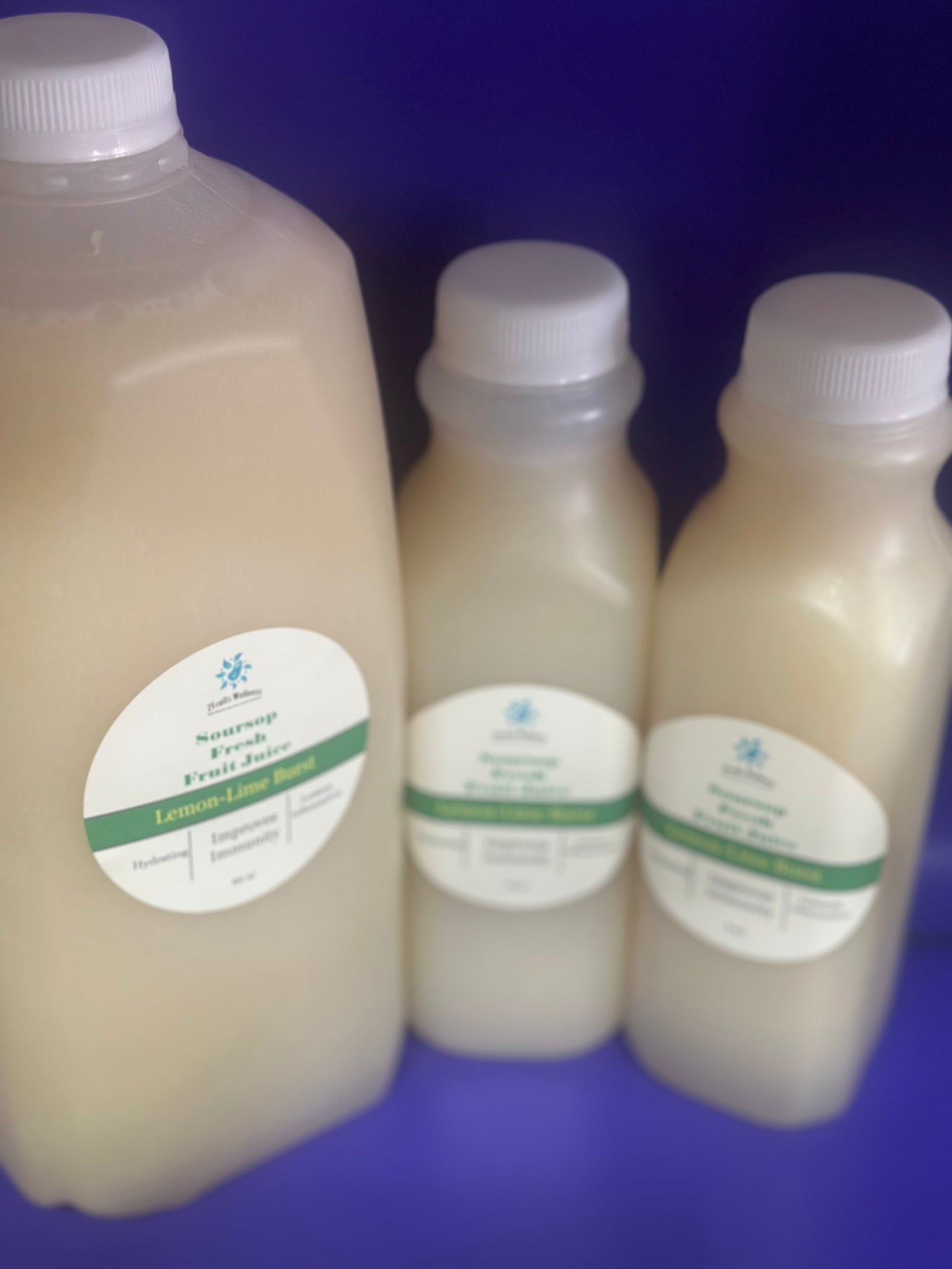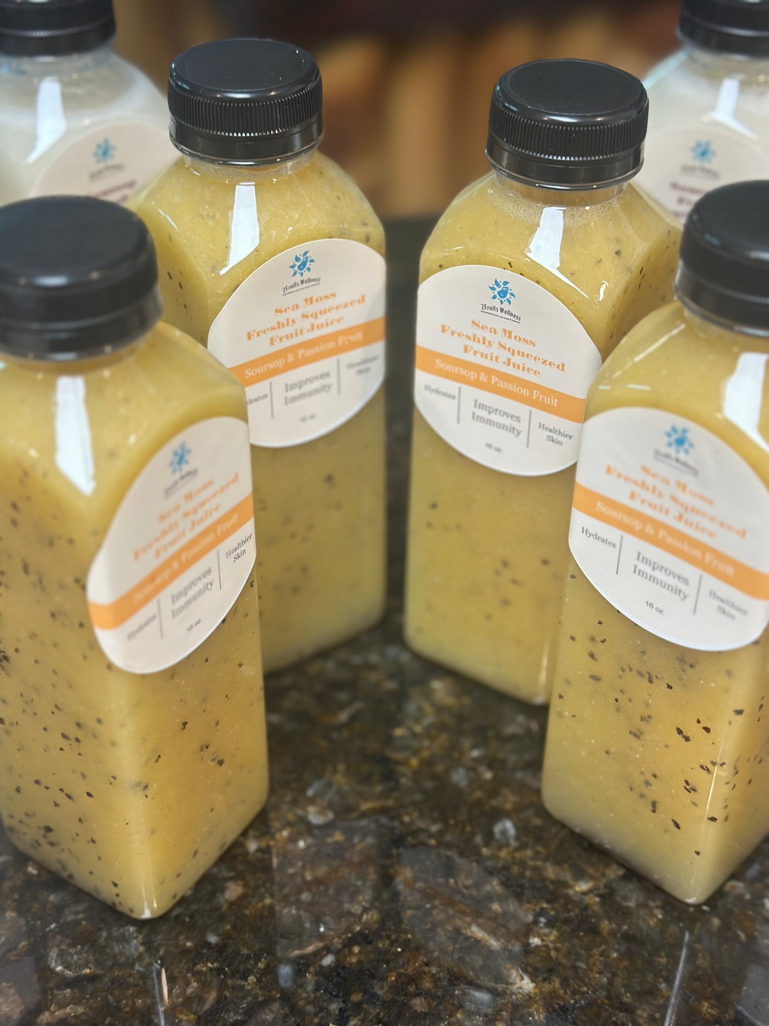 Each 16 oz bottle is made with love using fresh soursop pulp and alkaline water, with optional upgrades like sea moss, ginger, or herbal infusions for an added wellness punch.